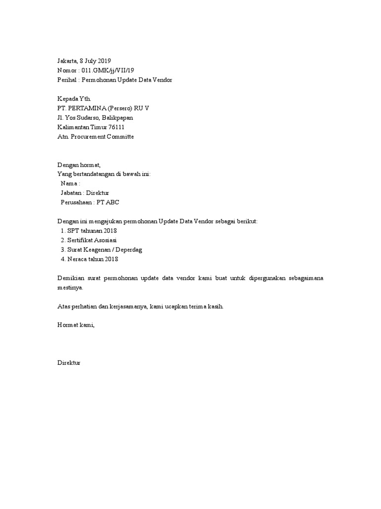 Surat Permohonan Update Data Vendor Pdf